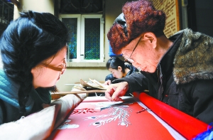 3月5日,高中武老人(右)在向前来学习蜀绣的学生演示蜀绣技法。