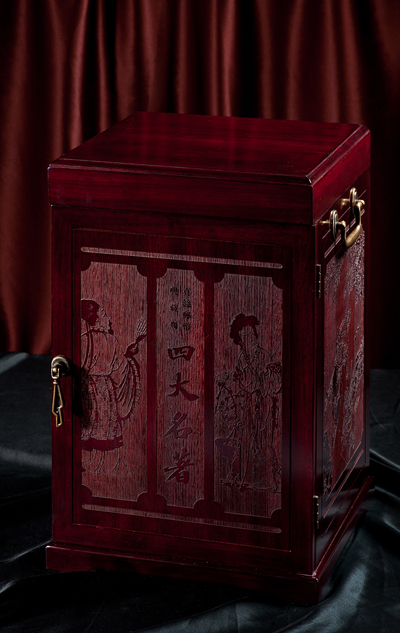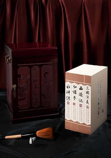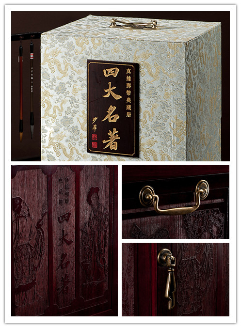 真丝邮票典藏版《四大名着》包装盒是整个产品的点睛之笔,该款套装的包装完全还原明清时代的风格,典雅奢华的木盒配上清代时期的铜扣铜锁显得精致而古朴,木盒四面极富创新的雕刻着四本着作中最经典的人物故事,使整个产品包装透露出浓厚的书卷气和时代性,叫人眼前一亮。