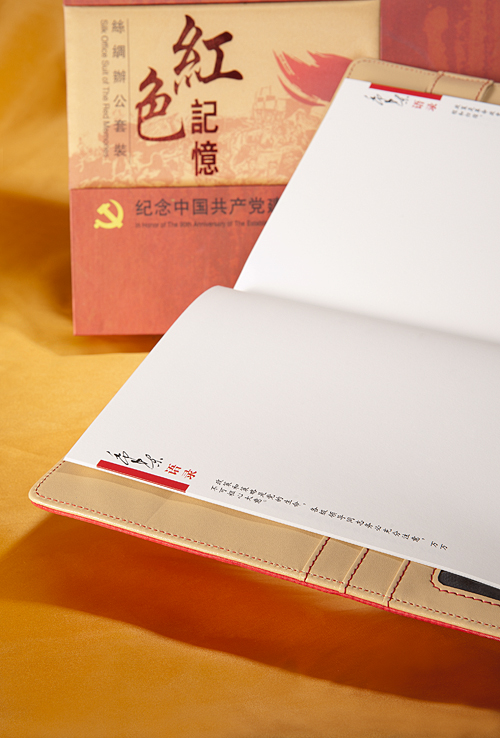 丝绸笔记本套装《红色记忆》是采用现代丝绸高科技,将传统名贵丝绸与办公笔记本巧妙结合而创新的一款充满时代气息的精品笔记本套装。它提炼了富含深刻哲理和思想的毛泽东语录为主题内容,并将诸多经典的元素经过艺术化处理,演绎为极具设计感的独特纹样,采用高精度色织提花技术,加之精湛的传统手工工艺精制而成。与此同时,该套装还创造性地组合了一款带有红色文化印记的钢笔作为点睛之笔,整体华而不艳,美而不俗,做工精致,色彩瑰丽,不仅富有浓郁的东方民族特色,而且独具那段火红岁月的时代气息,引领人们重拾那段难忘的“红色记忆”。