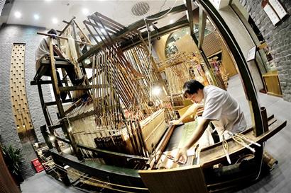 走进蜀国锦绣蜀锦博物馆,陈列着4台蜀锦手工织机,蜀锦艺人正在织机前忙碌。“它们的全称是蜀锦花楼木织机,其中一台来自清代,其他3台都是据此仿造的。”49岁的四川省工艺美术大师贺斌,织造蜀锦已有30多年了。贺斌说:“在我这一辈里,我是四川唯一掌握了蜀锦手工织造全套工艺的人。”