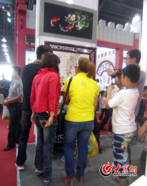 8日下午,在成都展团蜀绣的展位,众多观众一起欣赏讨论本次展出的蜀绣名作“芙蓉鲤鱼”。“‘芙蓉鲤鱼’是蜀绣的主要代表作品,鲤鱼图案在民间有吉祥如意、年年有余的寓意。芙蓉花是成都市花,有鲜明的地方特色,在国内外享有盛名。”代表蜀绣参展的工作人员江碧华告诉记者。