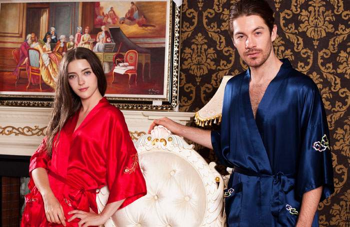 睡袍两层都选用高档丝绸面料,光泽柔和,手感丝滑舒适。精致手工刺绣的龙凤图案,栩栩如生,尽显华贵气质。